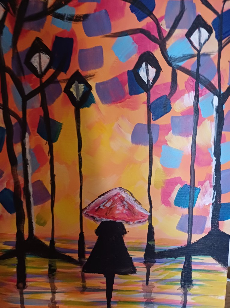 I think I must have done some painting at school and also when my children were younger but I can’t remember sitting painting as an adult; painting a room maybe. I ventured into painting by accident really as part of a carers activity and I loved it. The instructor guided you through each stage of the painting and you followed along and no one ended up with a painting that didn’t resemble the original image. So when I saw a similar event to paint the above image, I signed up straight away. I was a little apprehensive as I didn’t know if I could end up with a decent painting but I am really happy with this. I’ve done a couple of acrylic paintings but would love to try my hand at watercolours next and see how I get on. (I’ve also painted a couple of Christmas cards too!).